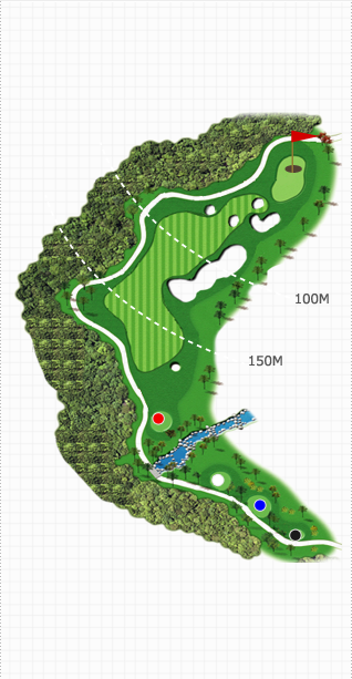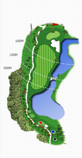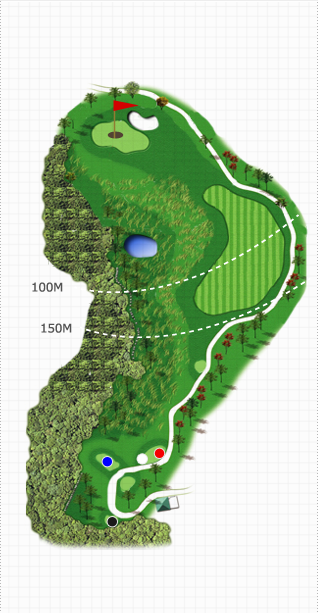 Green주변해저드가 위협적으로 도사리고 있으나 우측 능선을 이용하면 행운도 함께 할 수 있는 홀입니다. Green 주변 Water Hazard가 위협적으로 도사리고 있어 자칫 Tee Shot에 대한 부담이 있으나 Green 우측에 넓은 에이프런을 가지고 있어 안정감이 드는 홀입니다.신중한 클럽선택과 거리조절, Hazard에 대한 부담감을 떨쳐버리면 좋은 결과를 얻을 수 있습니다.