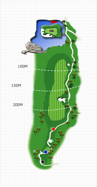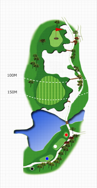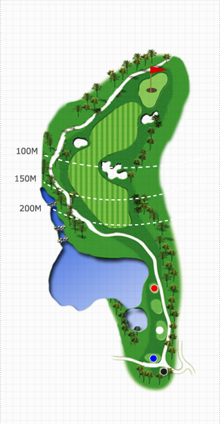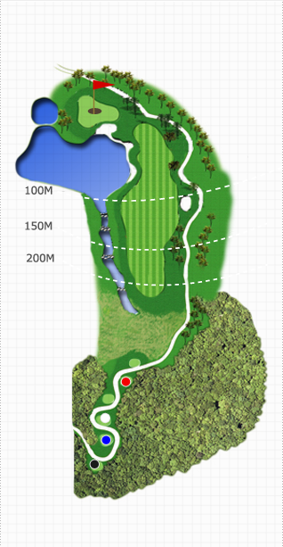 30m이상 하향홀로 우측은 OB지역이고 좌측은 Lake가 버티고 있어 안정된 플레이를 요구한다. 생태습지, 계곡, 푸른호수, 비치벙커, 초화류, 형형색색의 아리따운 수목이 짙은 초록의 Fairway와 어울려 아름다운 세상을 연출하고 있습니다. 코스 구성 요소들이 다소 위협적으로 다가오나 자신감을 갖고 공략을 하면 좋은 결과를 줍니다. Tee Shot 시 우측은 OB지역이고 좌측은 Lake가 버티고 있어 안정된 플레이를 요구하며 바람의 영향도 많이 받는 홀로 전략과 정확한 클럽 선택만이 좋은 score를 보장해 줍니다.