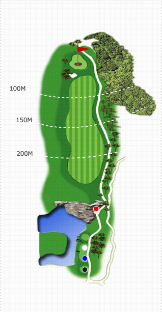 Island Green 형태의 홀. Green 좌측은 워터헤저드, 우측은 Bunker로 둘러쌓여 완벽한 Shot을 요구합니다. 발아래 계곡과 호수, Green Side Bunker가 Player를 무척 긴장 시킬 것입니다. 마치 악마가 Ball을 삼킬 것 같은 두려움마저 드는 역동적이고 고난도의 Par3홀 입니다. 정확한 거리, 정확한 클럽선택, 바람 등등… 모든 요소들이 완벽을 이루어야만 공략이 가능합니다. 자신의 실력, 운, 모든 걸 시험해 보시길 바랍니다.
