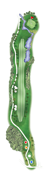 좌측으로 도그렉홀로서 IP지역 좌, 우측에 연못이 자리 잡고 있고 비교적 짧은 홀이므로 무리한 티샷보다는 세컨샷을 염두에 둔 코스공략이 바람직하다. 이 홀은 정확한 티샷과 세컨샷의 정확한 거리가 요구되는 홀이다.