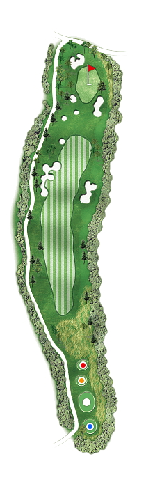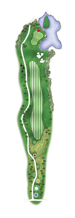 세컨샷 지점에서 좌측으로 휘어진 도그렉 홀이며 좌측 IP지점에는 가까운 쪽으로 보내려는 골퍼를 기다리는 벙커가 자리하고 있고 우측에는 TEE BOX부터 흐르는 계류가 형성되어 있다. 비교적 IP지점은 넓은 편이니 거리에 욕심을 내지 말고 페어웨이 가운데 IP지점 소나무 방향으로 공략하는 것이 좋다.