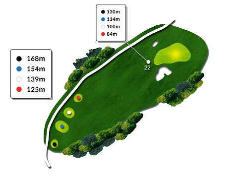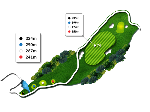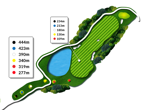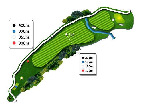 드라이버 200m 이상 거리가 나와야 폰드를 넘어 안착됩니다. 거리가 부담스러운 경우 페어웨이 우측을 겨냥하세요.