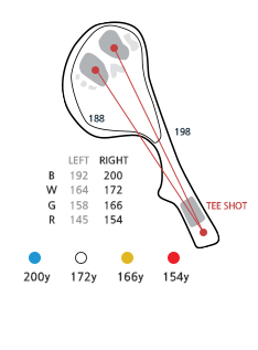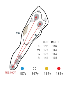 좌,우측 OB입니다. 비교적 짧은 파4홀이나 세컨샷에서 그린 공략시 핀의 위치가 매우 중요한 홀입니다. 특히 우그린 백핀일 경우 정확한 샷이 요구됩니다. 우그린 우측앞 깊은 벙커가 있어 정확한 샷을 해야 하며, 부분적 경사를 아주 잘 봐야 합니다. 우그린 백핀일 경우 약간 길게 치는 것이 더 유리합니다.