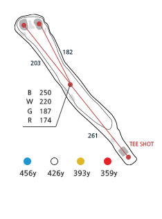 좌우측 OB이며 티샷은 약간 좌측으로 공략합니다. 세컨샷은 볼의 낙하지점에서 우측으로 바운드가 되므로 좌측으로 공략하는 것이 유리합니다. 그린과 그린 사이앞 벙커를 조심하여야 하며, 좌그린 앞측 벙커도 주의해야 합니다. 봄이면 진달래꽃이 아지랑이와 어우러져 봄을 알립니다. 겨울이면 토끼와 고라니 꿩 등을 볼 수 있으며 꿩이 울부짖는 소리에 한번 더 뒤돌아보게 하는 홀입니다.