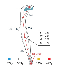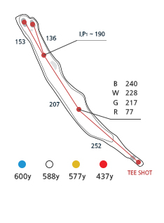 2008년 겨울 새로 만든 해저드로 BLUE Tee 에서 해저드까지 240야드인 야심만만한 홀입니다. 티샷은 좌 우측 OB이며, 티잉그라운드 위치에 따라서 티샷공략방향이 결정되는 파 5홀입니다. OB특설티가 설치되어 있습니다. 좌그린 좌측의 깊은벙커가 있어 벙커를 피해서 치시거나 또는 공격적인 플레이를 하시기도 하며, 우그린 사용시는 핀의 위치를 정확히 확인 후 쳐야 퍼팅이 유리합니다.