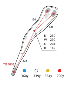 페어웨이가 우측에서 좌측으로 약간의 경사가 있으며 좌,우측 OB가 있고 좌측에는 벙커가 있어 티샷은 약간 우측으로 공략하는 것이 유리합니다. 200야드 거리목이 있는 긴 파4홀입니다. OB특설티가 설치되어 있습니다. 우그린 우측 앞에 벙커가 있으며 그린뒤쪽으로 넘어가면 OB이므로 세컨샷은 클럽선택을 신중하게 하여야합니다. 좌,우 거리차이가 많이 나는 홀이며, Longest 홀입니다.