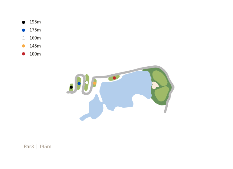 아일랜드 그린 같은 홀로 워터 해저드의 패널티 구역을 무조건 넘겨야 하는 부담감이 있는 홀이다. 돌아갈 길이 없는 All or Nothing으로 롱아이언 티샷을 테스트하나 파세이브한다면 성취감을 느낄 수 있다.