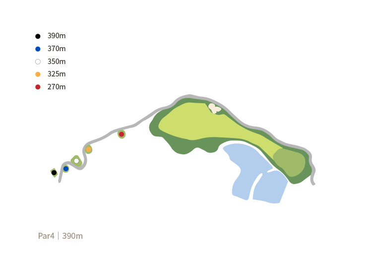 계곡을 따라 내려가는 홀로 3 개의 모든 샷을 잘 쳐야 온 그린 할 ㅅ ㅜ잇는 긴장해야 하는 홀이다. 티 샷은 IP 우측을 겨냥 해야 이 지점에서 세컨샷 랜딩 에어리어를 볼 수 있다. 세컨샷은 드로우 볼이나 훅 볼로 2 IP 좌측으로 보내는 것이 베스트이다. 그린이 1시 방향이어서 2 IP 좌측에서 공략이 유리하다.