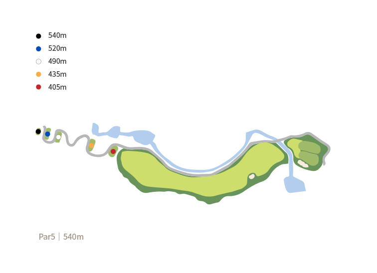 긴 Par 5 홀로 티샷이 스코어를 좌우 한다. 1 IP 좌측 벙커를 넘겨진 티샷이어야 세컨 샷을 2 Ip 우측으로 보내기 용이해지고 이 지점에서의 그린 공략이 쉬워지는 전략 홀이다. 웨지로 3rd 샷을 공략한다면 버디도 할 수 있다.