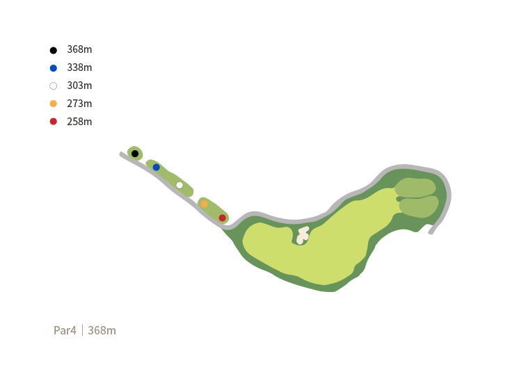 약간 오라막에 왼쪽으로 휘는 홀이다. 드라이버샷을 지름길로 보내기 위해서는 페어웨이 좌측 벙커를