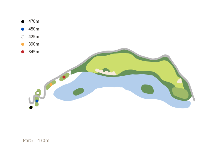 연못 속에 있는 새섬이 멋진 풍경을 연출한다. 연못을 따라 우측으로 휘는 도그레그 짧은 Par 5 홀로 투온을