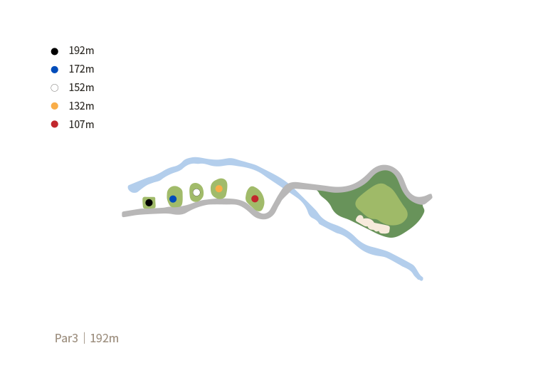 우측 벙커를 넘긴 우측 페어웨이다. RT에서 190m를 캐리 해야 하나 플레이어의 비거리를 고려한 목표 선정이 필요하다. 보기 플레이어는 이 홀에서 3 on 2 putt 로 안전한 홀아웃을 권한다.
