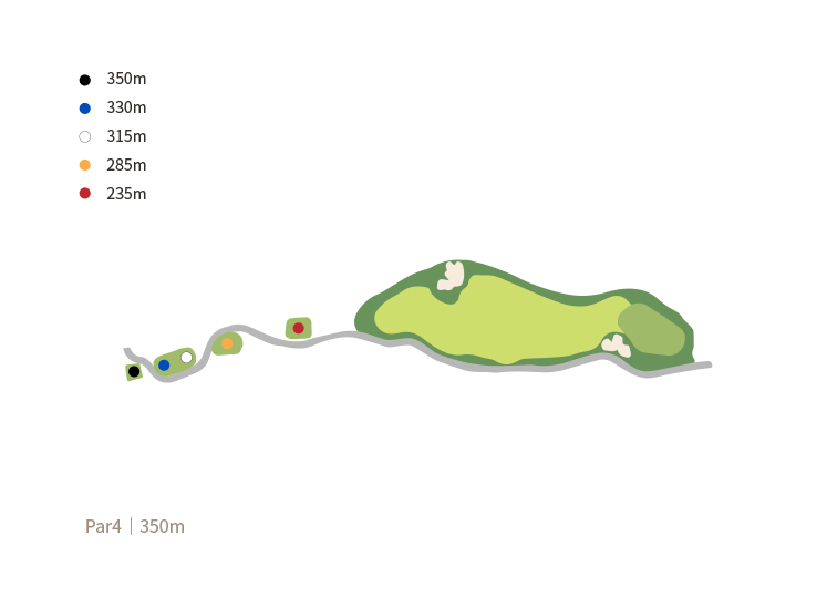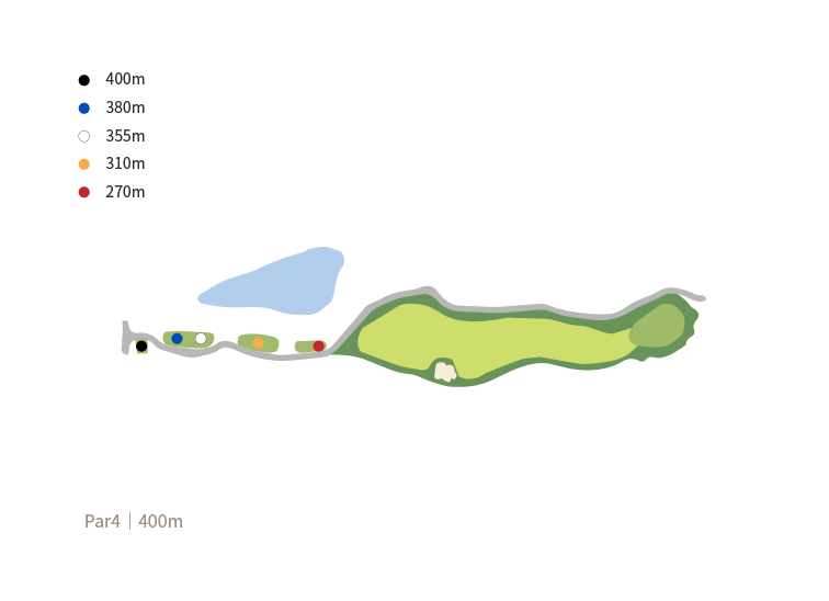 페어웨이 좌측의 연못과 계류가 특징이고, 그린 좌측의 자연암과 몇 그루의 소나무가 그린을 가드하고 있다.